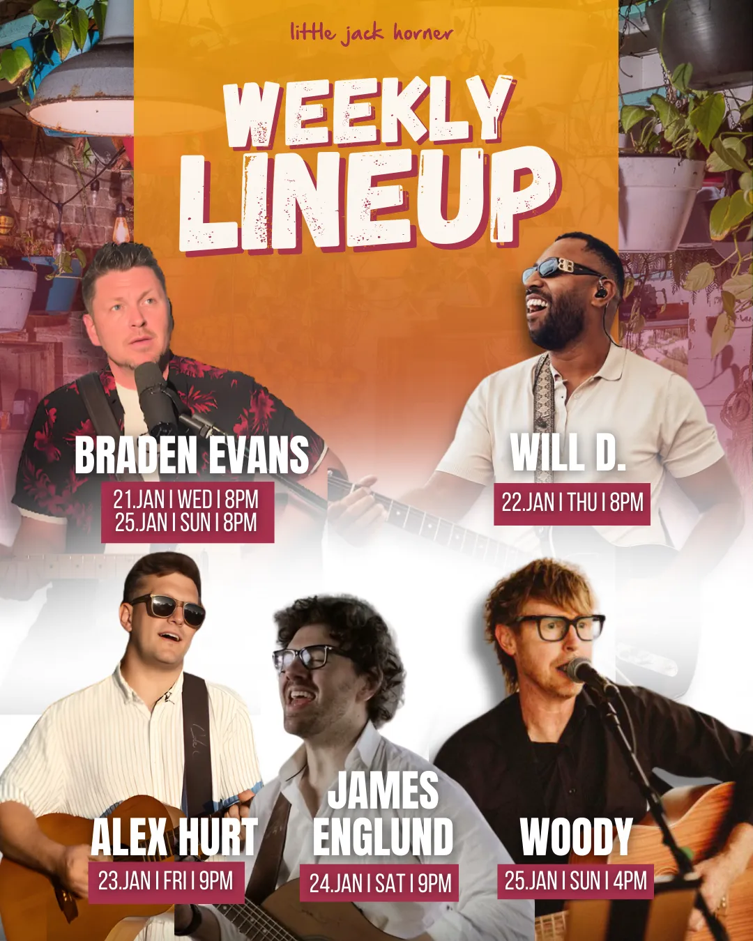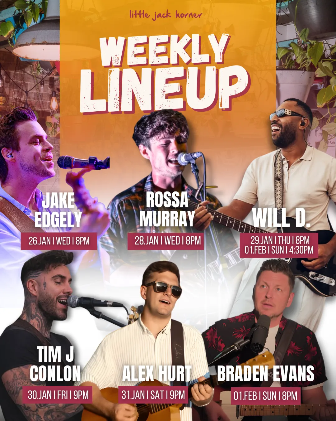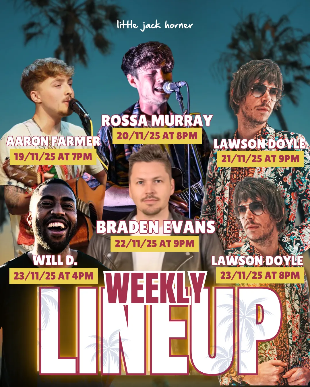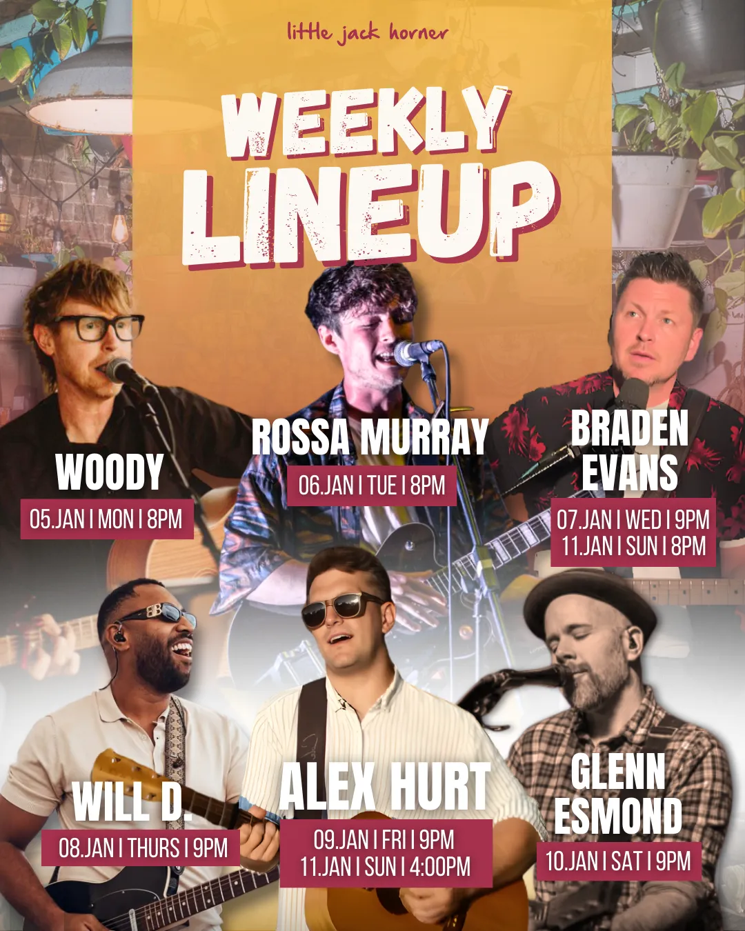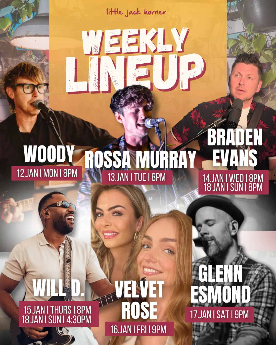 Turn up your weekends at Little Jack Horner with live music every Friday to Sunday! From smooth acoustic sets to energetic beats that get the crowd moving, we’ve got the soundtrack to your perfect night out. Whether you're grooving with mates, vibing solo, or just here for the music and mojitos, there's something for everyone. Let the rhythm lead your weekend escape as our talented artists bring the stage to life. Grab a drink, find your spot, and enjoy the tunes that make every night feel electric.