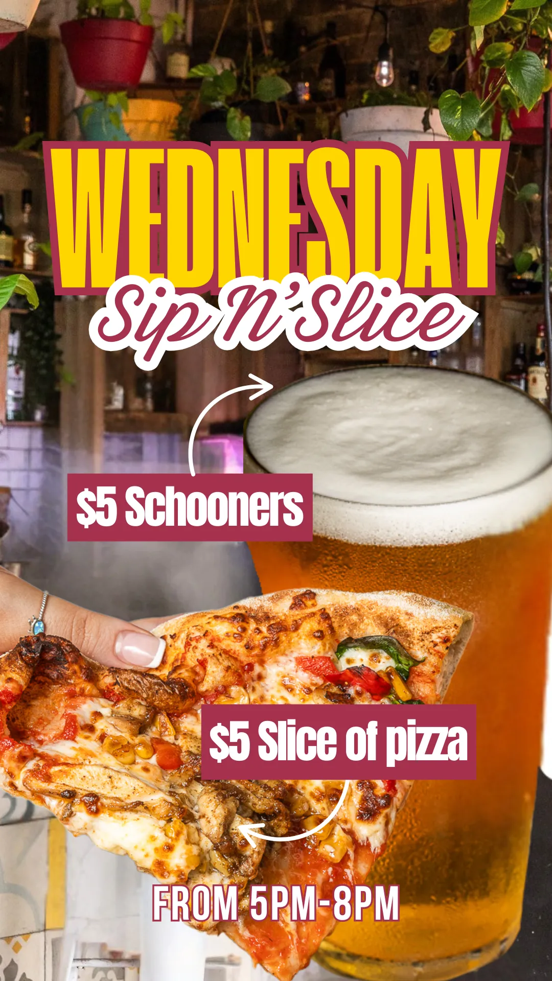 Shake off the midweek slump with unbeatable eats, breezy vibes, and budget-friendly sips that hit just right. We’re talking $5 pizza by the slice, fresh from the oven and loaded with flavor, plus $5 schmiddys to keep the good times flowing from day to night.